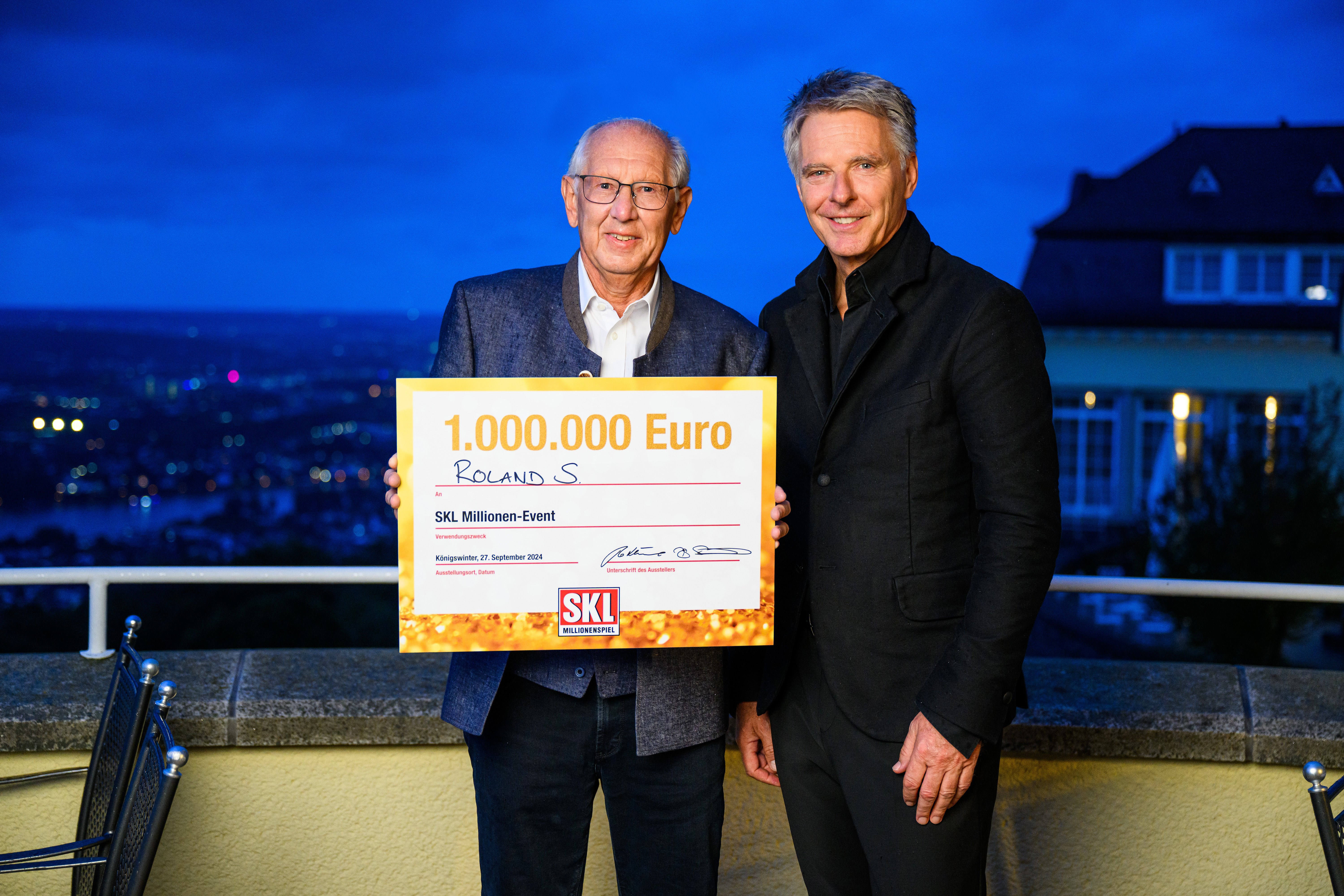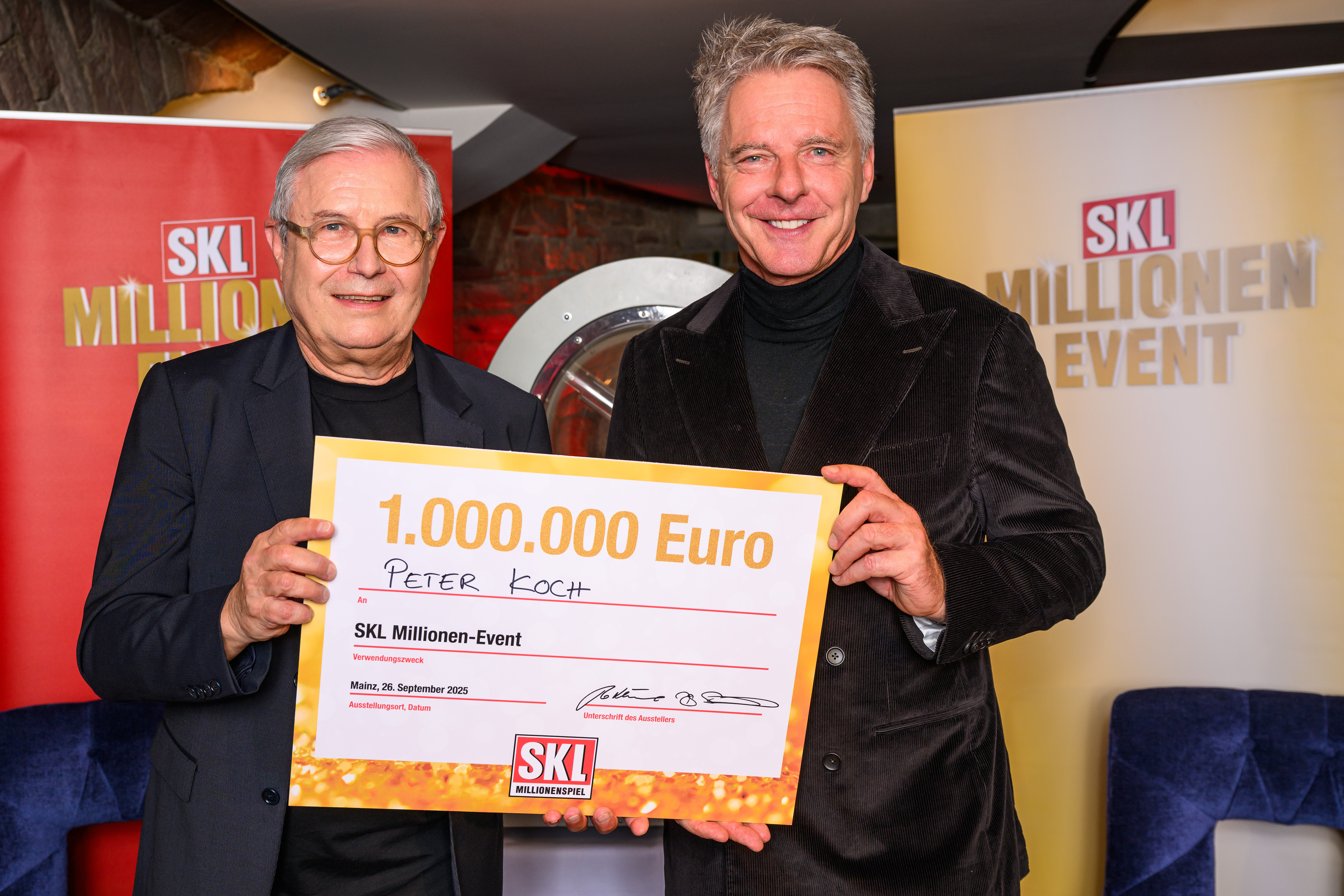 Glückspate und SKL-Markenbotschafter Jörg Pilawa überreicht Neu-Millionär Peter Koch den Scheck über 1 Million Euro
